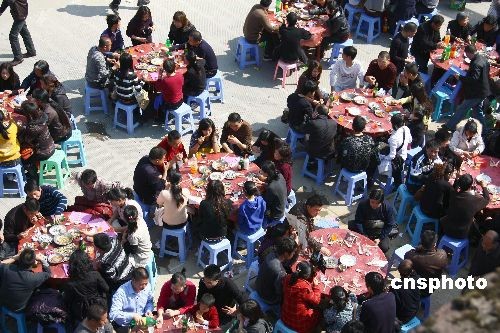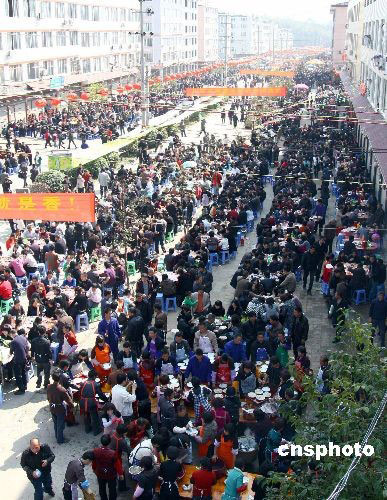 圖為位于雅陽的兩千多桌宴席。2月9日,中國傳統的元宵節,在浙江省泰順縣,在這一天就會邀請四方的賓客相聚在洲嶺、雅陽、西旸等地。今年雅陽的“百家宴”歷史以來規模也是最大的一次,達到一千多桌,一萬多人,且和文化旅游相組合,推出了許多的節目。現在,“百家宴”已經成為一種帶有民間聯誼性質的活動,人們歡聚一堂聯絡感情,互送祝福,譜寫盛世和諧新篇章。中新社發 鎬璽 攝