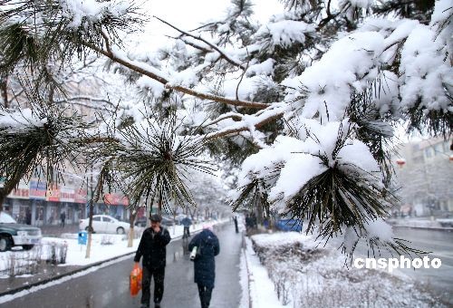 2月13日,新疆哈密地區出現降雪降溫天氣,哈密市街頭的樹木上掛滿了白雪,形成了美麗的雪凇景象。據了解,地處盆地的哈密市在春天出現雪凇現象十分少見。中新社發 蔡增樂 攝