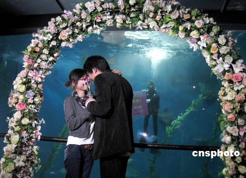 2月14日情人節,上海一名女孩在神秘的“海洋世界”前瑰麗的彩花門下接受男友求婚后,相擁盡享甜蜜時光。上海海洋世界在情人節為申城情侶開啟愛情的夢幻大門,在海洋水族館巨大玻璃前設立花門,有情人紛紛在此情定終生,讓神奇的“海洋世界”為他們見證愛情。中新社發 陳靜 攝