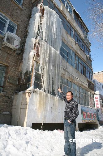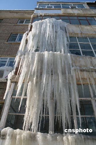 2月22日,在新疆阿勒泰市團結南路一居民樓上驚現壯觀的冰瀑奇觀,家住此樓的宋正國等四戶居民身受其擾。居民樓共四層冰瀑一直從三樓垂到一樓,十分壯觀。中新社發 唐曉波 攝