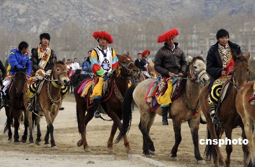 2月27日,中國(guó)藏歷年初三,拉薩賽馬場(chǎng),傳統(tǒng)賽馬與表演活動(dòng)開幕,參賽選手身穿傳統(tǒng)民族服裝亮相。中新社發(fā) 廖攀 攝