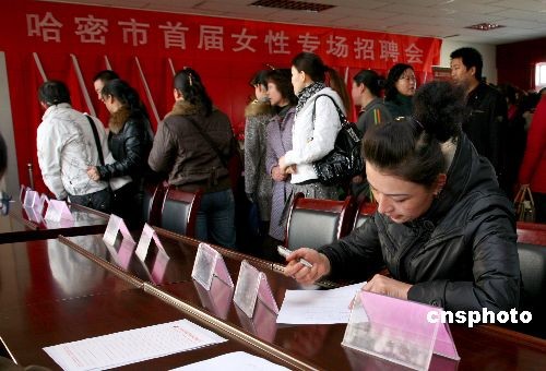 2月28日,新疆哈密市舉辦首屆女性專場招聘會,哈密市婦聯組織57家企業為下崗、待業和外來務工婦女準備了600多個崗位,吸引了千余名婦女前來應聘。中新社發 蔡增樂 攝