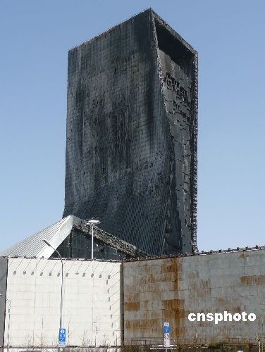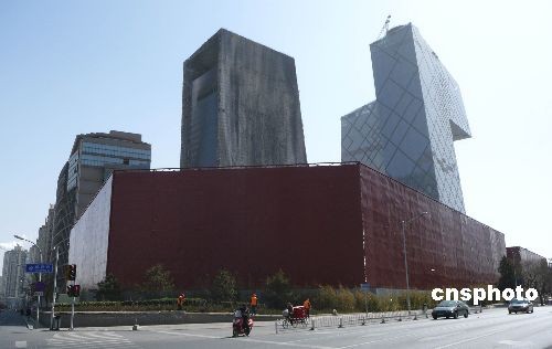 2009年3月13日,經過半個多月的施工,北京央視新樓北配樓火災現場旁的廣告牌搭建完畢,廣告牌已將央視北配樓部分樓體遮擋起來。中新社發 玉龍 攝