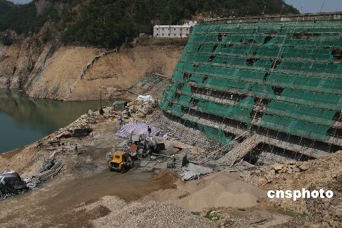 3月15日,浙江省天臺縣龍溪電站對水庫大壩進行加固。最近,該縣利用枯水期對所有的病危水庫進行除險加固,確保安全度汛。中新社發 丁必裕 攝