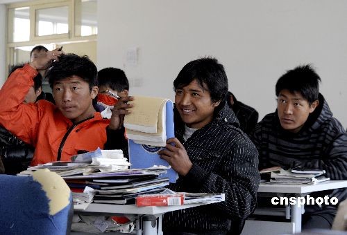 3月16日,西藏登山學校學生們在位于拉薩的中國最高的人工巖壁前。西藏登山學校的學員都是來自珠峰所在地的農牧民藏族青年,入學年齡在16-18歲,必須是初中畢業,身體素質要好。該校是國家扶貧項目,學員在校期間享受全部免費教育。中新社發 廖攀 攝