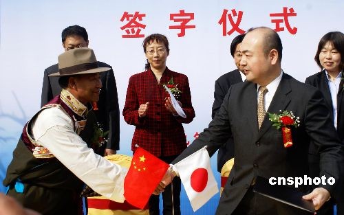 三月十七日,日本援助西藏扎囊縣醫院立民項目簽字儀式,在西藏自治區人民政府駐北京辦事處舉行。西藏自治區人民政府駐北京辦事處副主任趙國慶女士(右五)與日本駐華大使館公使片山和之先生(右四)出席了簽字儀式。此項目向扎囊縣醫院援助六十萬人民幣,扎囊縣常駐人口有三點六萬人。中新社發 馬偉東 攝