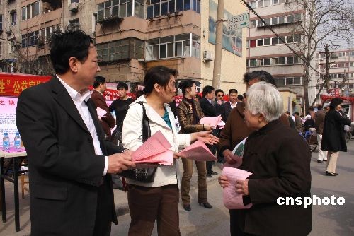 三月十九日上午,河南省強(qiáng)制隔離戒毒所所長(zhǎng)陳新民(左)向社區(qū)居民發(fā)放禁毒公開信。當(dāng)日,陳新民率領(lǐng)干警深入社區(qū)門口,給居民講解毒品危害,勸居民遠(yuǎn)離毒品。中新社發(fā) 王中舉 攝