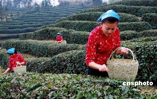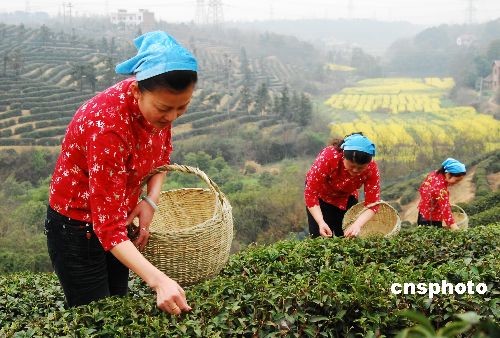 3月19日,廬山云霧茶各生產基地開始采摘新茶。這也意味著品質最好的廬山云霧茶新茶“明前茶”將開始進入市場。廬山云霧茶因日照霧薰,其味清香異常,經久不散,是中國有名的特種茶,以“味醇、色秀、香馨、液清”而久負盛名,連續兩屆獲中國國際茶業博覽會金獎。中新社發 胡國林 攝