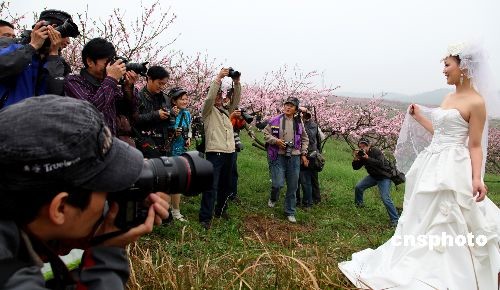 3月21日,攝影師們正在以婚紗美女為模特進行拍攝。由宜昌市攝影家協會、三峽廣電新聞網及“真愛”婚紗攝影共同舉辦“三峽春天攝影大賽”日前在枝江萬畝桃花園開賽,百余名專業攝影師及攝影愛好者以攝影會友。 中新社發 望作信 攝