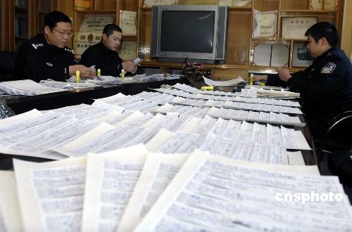 北京豐臺警方經縝密偵查,近日一舉將一個用電話進行詐騙的特大犯罪團伙打掉,15名嫌犯全部落網。警員正在整理該團伙從網上購買的個人信息。中新社發 楊陽 攝