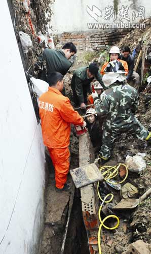 為保證被困人員安全同時(shí)防止第二次塌方,消防員迅速找來四根粗大的木料,將周邊松動(dòng)的水泥墻死死頂住。實(shí)施救援時(shí),消防員首先嘗試用風(fēng)鎬鑿碎溝底的水泥管,幾分鐘后很快鑿穿,不料余師傅的右腿依然動(dòng)彈不得;接著找來兩個(gè)氣墊,通過腳踩增壓,以求擴(kuò)大余師傅右腿所在的空間,結(jié)果效果不理想;繼而又找來千斤頂,還是無濟(jì)于事。發(fā)現(xiàn)只有吊起坍塌的墻體,才能從根本上解決問題。于是調(diào)來吊車,隔著院墻伸出吊臂,正好坍塌墻體上有個(gè)排水孔,消防員設(shè)法將鋼絲繩繞過了排水洞。吊車司機(jī)小心翼翼地操作,既要減輕被夾者的痛苦,又要繞過坍塌現(xiàn)場的線纜,而且盡可能在起吊過程中確保墻體不能斷裂。幸好,起吊墻體四周泥土較為松軟,11時(shí)20分左右,墻體被成功吊起,消防戰(zhàn)士迅速將余師傅抱出水溝。劉蔚丹 饒純武 黃康 攝