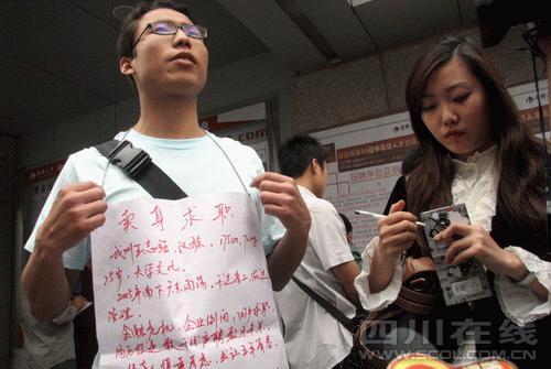 想找份好工作,就要學會推銷自己。昨(26)日上午,成都市人才市場門口出現了讓人目瞪口呆的一幕:一名25歲的小伙子身掛“求職”招牌,尋求一份年薪10萬元的工作。如此推銷自己,他也坦然承認:我就是在包裝自己而已。