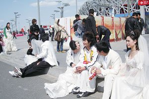這11對新人的攝影師姚先生介紹,他們來自天津薊縣,11對新人均為影樓顧客。為了在鳥巢、水立方前留下結婚紀念,這11對新人專程組團來到奧林匹克公園。