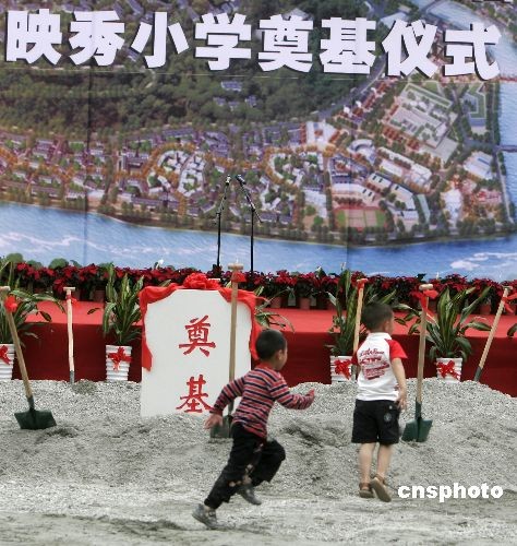 5月11日,四川省汶川縣映秀鎮(zhèn)災(zāi)后恢復(fù)重建項(xiàng)目開工暨映秀小學(xué)新校舍奠基儀式舉行。映秀小學(xué)在地震中校舍徹底倒塌,孩子們?cè)诎宸可险n至今。新校舍由深圳證監(jiān)局捐建,用地10446平方米,其中綠地面積大于35%,總投資2951.6萬元,擬建6層,可容納12個(gè)班,學(xué)校運(yùn)動(dòng)場作為臨時(shí)避災(zāi)場地。預(yù)計(jì)工期5個(gè)月。 同期開工的還有包括映秀幼兒園、中灘堡大道、漁子溪大橋和映秀鎮(zhèn)安居房等映秀鎮(zhèn)災(zāi)后恢復(fù)重建項(xiàng)目。中新社發(fā) 張曉理 攝