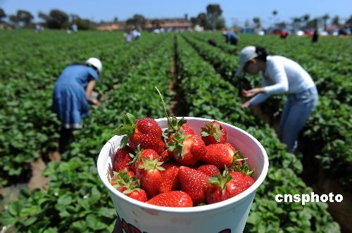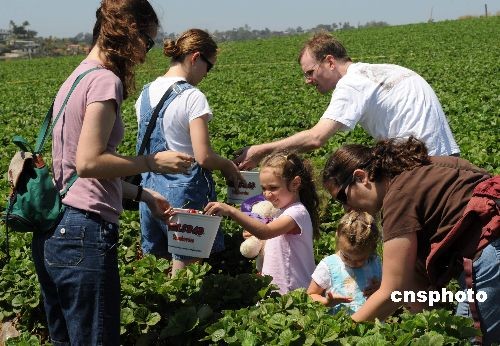 當(dāng)?shù)貢r(shí)間五月二十三日,許多居民來到加州卡爾斯班的草莓田采摘鮮嫩誘人的草莓。當(dāng)天是美國陣亡將士紀(jì)念日假期的第一天,通常也是美國民眾出游的日子。據(jù)美國汽車協(xié)會(huì)預(yù)測,盡管遭遇經(jīng)濟(jì)衰退和甲型H1N1流感疫情,但這個(gè)周末仍有三千兩百多萬美國人出游,比去年同期增長百分之一點(diǎn)五。中新社發(fā) 張煒 攝