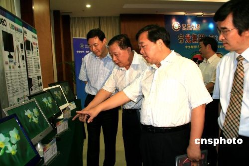 7月20日上午,揚州舉行由某集團自主研發的LED顯示終端系列產品發布會并現場進行展示,凸顯LED終端顯示應用產品在健康、節能、環保和超薄、時尚等方面超前的理念。揚州市委書記季建業、市長王燕文等出席。季建業(右二)表示,揚州要著力推動綠色新能源產業的技術向高端突破,產品向終端延伸,推出“五個一”計劃,即1000萬臺LED顯示器、1000萬臺LED電視機、1000萬臺一體化筆記本電腦、1億盞LED燈、1億本E-book。到2012年,新能源、新光源產業實現產值“雙千億”。中新社發 崔佳明 攝