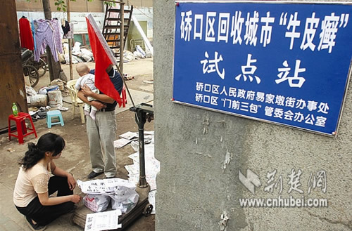 昨日(19日)上午,武漢市(湖北)硚口區易家墩街古三廢品回收站外,掛上“回收城市‘牛皮癬’試點站”的招牌,以高出普通廢紙2倍多的價格收購“牛皮癬”,激發了不少居民的除“癬”熱情。