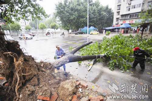 記者看到,在環(huán)山路東西湖區(qū)人民醫(yī)院附近的一個(gè)拆遷區(qū),這棵茂盛的梧桐樹(shù)根部拔起,歪倒于馬路上,將整條道路截?cái)唷?lái)往車輛調(diào)頭繞行。在事發(fā)地對(duì)面餐館工作的王先生介紹,29日中午11時(shí)35分,正在下大雨,這棵十余米高的梧桐樹(shù)根部松動(dòng),繼而“轟”的一聲倒地。當(dāng)時(shí),兩名打著雨傘的女青年正好路過(guò),梧桐樹(shù)的樹(shù)枝將她們的傘壓彎,兩人雖無(wú)礙,但也嚇得花容失色。