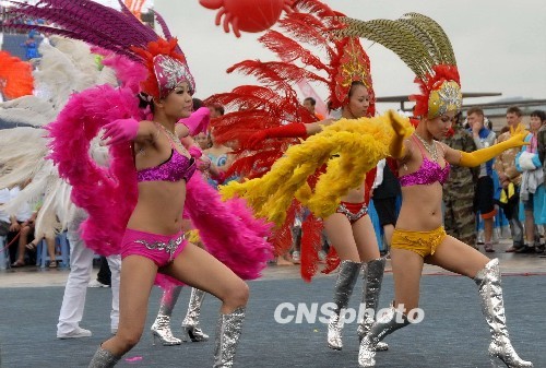 2009年7月18日,以“盛世中華,歡樂沙!睘橹黝}的2009大連國際沙灘文化節(jié)在金石灘黃金海岸隆重開幕。在為期一個月的時間內(nèi),將舉辦沙灘群眾體育系列活動、市民沙雕大賽、“快樂一家”家庭海灘趣味賽、沙灘節(jié)攝影大賽、沙灘文化節(jié)金石小姐大賽、沙灘節(jié)寶貝評選、首屆金石灘海泥狂歡節(jié)、大連發(fā)現(xiàn)王國夏日狂歡節(jié)等十項活動。中新社發(fā) 王錫增 攝