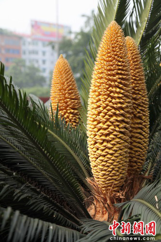 中新網宜賓6月28日電(劉龍泉)記者近日在四川省長寧縣城采訪時,有夏女士向記者報料說,在長寧縣城竹都大道276號一小區的鐵樹,這幾年不僅年年開花,而且開得很有名堂,出現1株開3花、1株開2花、花果同現等奇景,值得一看。