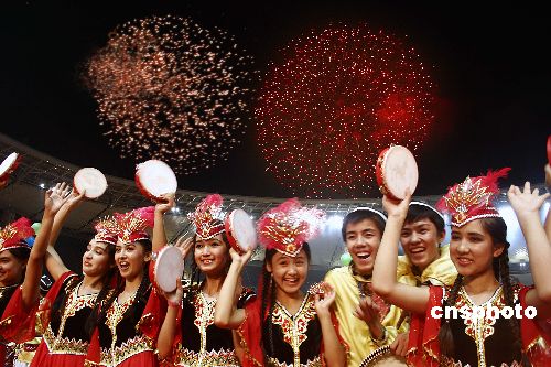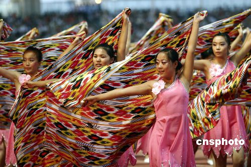 | 八月十二日晚,眾多新疆維吾爾族帥哥美女為參加新疆十一運的運動員吶喊助威。當天,新疆維吾爾自治區第十一屆運動會在新疆體育中心隆重開幕,可容納五萬人的體育場內座無虛席,現場彩球高懸、歡聲笑語。本屆運動會分設行業組和地州市組,其中行業組包括乒乓球、游泳、羽毛球、男子籃球、田徑五個比賽項目;地州市組共設16個比賽項目,包括沙灘排球、跆拳道、射箭等。來自新疆各地州和行業體協的二十二支代表團的體育健兒將展開激烈角逐。中新社發 劉新 攝