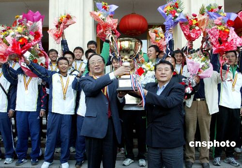 | 十一月四日,榮獲全國足球乙級聯賽冠軍并晉升甲級聯賽的北京理工大學學生足球隊勝利凱旋,受到該校老師和學生的熱烈歡迎和祝福。2006年11月2日,全國足球乙級聯賽決賽結束,北京理工大學學生足球隊經過激烈拼搏,以3:0戰勝哈爾濱毅騰隊,榮獲全國乙級足球聯賽冠軍和道德風尚獎,球隊主教練金志揚榮獲最佳教練員獎。圖為北京理工大學校長匡鏡明(左)和球隊主教練金志揚(右)高舉獎杯和隊員們合影留念。中新社發 張勤 攝