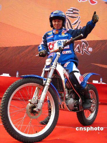 12月8日下午,中國首位摩托車手曹魯征戰(zhàn)2008年達(dá)喀爾拉力賽出征發(fā)車儀式在南京白馬公園舉行。今年30歲的曹魯曾先后獲得全國摩托車越野技巧賽冠軍、第二屆中國沙漠環(huán)塔拉力賽摩托車組總冠軍等榮譽(yù)。這次曹魯成為第一位摩托車手代表中國參加2008年1月5日發(fā)車的第30屆巴黎--達(dá)喀爾拉力賽,實(shí)現(xiàn)了他個人和中國摩托車界的夢想。中新社發(fā) 谷昌旺 攝