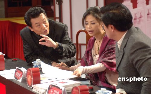 | 十二月七日,江中亮嗓“紅樓夢中人”大型選秀活動組委會在北京大觀園酒店召開發布會,宣布該活動臺灣賽區正式設立。至此,該大型選秀活動全國十個賽區全部正式啟動,成為全球華人共同參與的選秀活動,特別是有著相同中華傳統文化、同根同源的兩岸三地共同參與。圖為當日在北京大觀園舉行的第二階段選秀比賽在進行中。著名紅學家“八七版”《紅樓夢》編劇周嶺(左),上一輪比賽評委田原鴻(田秣)(中),國家話劇院一級演員王衛國(右),擔任評委。中新社發 鄒憲 攝