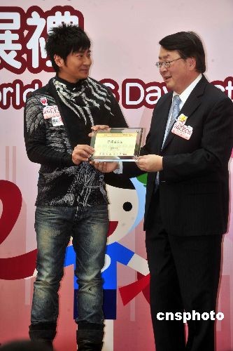 十二月一日是世界艾滋病日,著名歌星孫耀威(左)在香港“2008年世界艾滋病日”活動開展禮上,受到衛(wèi)生署署長林秉恩的致謝。中新社發(fā) 譚達(dá)明 攝