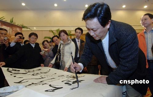三月二十四日,在電視連續劇《鄭和下西洋》中飾演明成祖朱棣的著名演員唐國強在福州舉行的該劇開播儀式上現場揮毫題字。該劇是為紀念鄭和下西洋600周年特別拍攝的,由福建省委宣傳部、中央電視臺文藝中心影視部及長樂市委、市政府等單位聯合出品。《鄭和下西洋》史詩般地描述了鄭和率領船隊七下西洋,歷時二十九年,成功開辟海上絲綢之路的壯舉,展現了鄭和七次下西洋在政治、經濟、文化、外交、科技等領域取得的輝煌成就。中新社發 劉可耕 攝