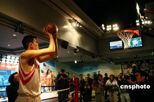 NBA中國球員姚明的蠟像18日首次在紐約杜莎夫人蠟像館與公眾見面,引來眾多媒體關注。 中新社發 李靜 攝