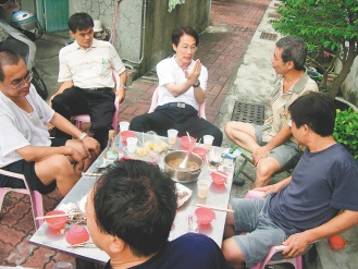 中新網(wǎng)6月29日電 據(jù)臺灣《聯(lián)合報(bào)》報(bào)道,中國國民黨大臺南市長參選人郭添財(cái)日前深入臺南市南區(qū),走訪21名國民黨籍里長。郭添財(cái)與里長伯、民眾一起在庭院用餐、聊天、聽取建議,展現(xiàn)草根性與親和力。