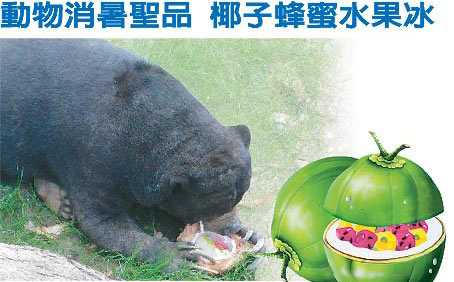 高雄市壽山動物園的紅毛猩猩、馬來熊更高檔,大吃食材豐富的“椰子蜂蜜水果冰”,樂不可支。