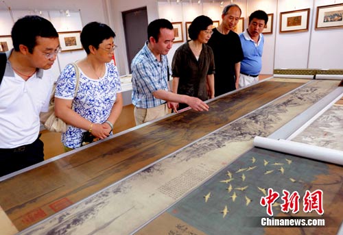 7月8日,觀眾在福州舉辦的“兩岸故宮高仿真宮廷畫聯(lián)展”上被展出的一幅合璧版仿真《富春山居圖》所深深吸引!陡淮荷骄訄D》是元朝畫家黃公望的代表作,是其為無用師和尚所繪,以浙江富春江為背景,全圖用墨淡雅,山和水的布置疏密得當,墨色濃淡干濕并用,極富變化,被譽為中國十大傳世名畫之一,其流傳經(jīng)歷充滿傳奇色彩,目前兩岸各存一段。據(jù)了解,此次“兩岸故宮高仿真宮廷畫聯(lián)展”共展出130余件高仿真作品,囊括了隋唐五代、宋、元、明、清和近代各個時期書畫名家的傳世佳作。