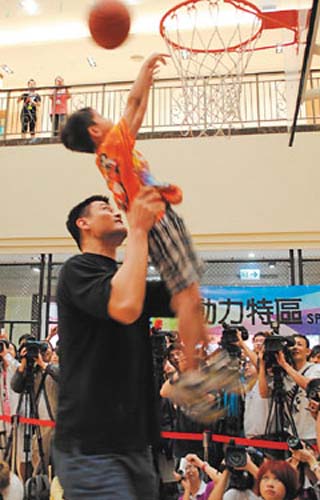 姚明說,很高興到高雄縣和災區小朋友聊天交流,“希望能帶給大家愉快的體驗”。他教導學生們灌籃技巧,以簡單的互動教學,傳達他的愛與關懷。