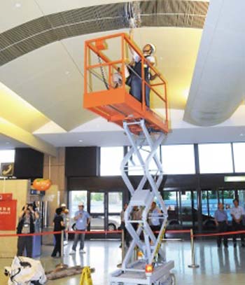 27日下午2時40分在出境大廳第六號柜臺前方服勤的工作人員,發現天花板上有粉塵掉落,連忙通報航空站人員到場。航站人員搬來活動欄桿把整個區域封閉,禁止旅客通過,天花板上鋼柵欄細縫中就有小塊的混凝土碎石掉落。