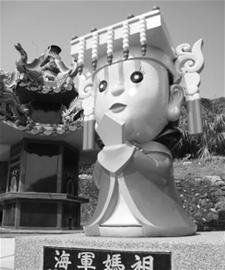 除了天顯宮,與臺軍方關系相當密切的廟宇,還有蘇澳中正軍港內的媽祖廟進安宮。30多年來,進安宮成為當地官兵的信仰對象,各型軍艦進港都會前往祈福。去年底蘇澳民眾請示媽祖后,還捐資建立了一座高達3米的“海軍媽祖”石像(如圖),成為軍港的地標,據稱歷任海軍高級將領幾乎都會來這里上香。作為全臺唯一軍方與地方共管的廟宇,民眾到進安宮參拜媽祖,還要先登記,并且只有假日才能進香。