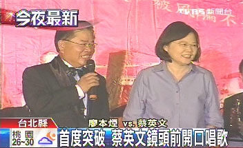 昨晚在永和市樂華夜市,“立委”廖本煙唱“小城故事”,他好幾次想找機(jī)會(huì)把麥克風(fēng)往蔡英文面前比,但她像看到火把,馬上靠邊閃。不過電視畫面顯示,蔡英文也還是首度突破自我,開始開口唱歌,看她嘴型,咬字還蠻完整。