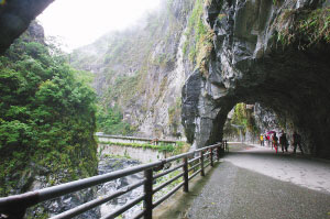 當我們乘坐的旅游大巴車進入太魯閣大峽谷中最險峻也最值得一看的九曲洞峽谷時,我驚奇地看到,進出九曲洞的游客個個頭頂安全帽。導(dǎo)游說,前幾年的臺灣大地震,太魯閣大峽谷不少山體巖石松動,山上經(jīng)常有細小石子滾落下來,為了避免傷及游客,景點管理者要求每位游客必須佩戴安全帽方能進入九曲洞游覽區(qū)參觀。