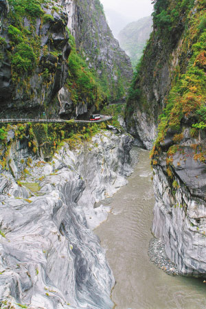 按行程安排,我們當晚就要馬不停蹄地趕往100公里外的宜蘭縣。到宜蘭縣已是晚上9點多,下榻的酒店就在路邊。沿途有不少都是溫泉酒店,大部分建在路邊,規(guī)模不大,都是私人經(jīng)營,但很干凈。次日早餐后,我們冒雨乘車駛上橫貫臺灣南北的中橫公路。當天主要是游覽臺灣著名景點———花蓮縣的太魯閣大峽谷。