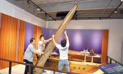 “國史館”接收后,花了近二十萬元修復(fù)。這次展覽,“臺(tái)馬號(hào)”因體積龐大,只能平放船身,無法豎起藤編的船帆。