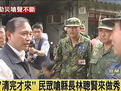 昨天天氣短暫放晴,宜蘭縣長林聰賢巡視淹水災區,卻出現不尋常的現象,幾乎走到哪就被罵到哪,一名民眾說,都淹了好幾天了,還是靠著臺北的女兒上網把淹水的情況公布給大家知道,縣長這個時候才到。也有老婦人說,淹水的時候看不到縣政府的人員前來,還不是靠著自己的力量清理家園,都快清得差不多了,縣長才出現。