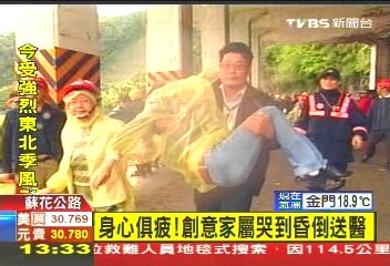 據(jù)臺灣TVBS電視臺報(bào)道,蘇花公路搜救行動已進(jìn)入第7天,20名失聯(lián)大陸游客的任何消息都牽動著他們家屬的心。焦急等待的心情加上惡劣氣候,使得一名創(chuàng)意旅行社失聯(lián)大陸游客家屬在今(27)日中午哭到昏倒,送醫(yī)救治。