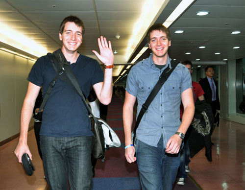 中新網11月15日電 據“中央社”報道,電影《哈利波特》系列首度有演員造訪臺灣,片中飾演榮恩雙胞胎哥哥的詹姆斯與奧立佛·菲爾普斯15日抵臺,他們親切向大家問好,表示能到臺灣很興奮,不少粉絲熱情接機。