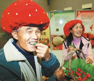 中新網11月30日電 臺灣農業部門舉辦的“二00七十大經典水果“票選活動,原本一路領先的臺南芒果大意失荊州,被苗栗草莓突襲,在投票截止前三小時翻盤,登上票選王座。苗栗縣長劉政鴻昨天興奮地戴上“草莓帽”領獎。