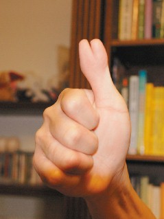 中新網3月22日電 支持馬蕭的臺東市陳姓男子右手大拇指,天生就比別人多一根,他自嘲,這個時候時機敏感,他不敢任意豎起大拇指,因恐泛綠朋友錯當他比“V”,遇到支持泛藍朋友,他明明以大拇指比V,又誤會他挺綠。