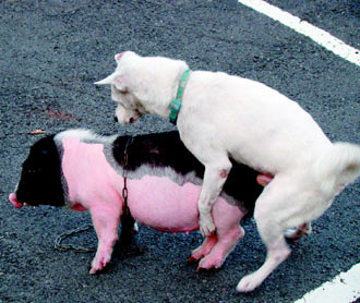 麝香豬的女主人,在嘉義市一家洗車場任洗車工,前天下午帶著麝香豬“曼尼”到洗車場,就讓愛豬在空地閑逛。一只十歲的土狗“拉奇”看到麝香豬后立即沖上前,麝香豬受到驚嚇,發出刺耳的尖叫四處逃竄,土狗卻硬將麝香豬“撞倒”,接著聞遍全身,最后“侵犯”了麝香豬。