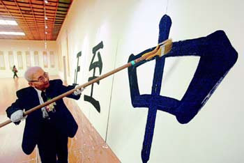 88歲的楊家麟原本想重現當年用木棍、鐵絲綁麻繩書寫大中至正的情景,但他昨天因關節炎舊疾發作、無力握筆,只好展出事先寫好的大字,象征性地比劃比劃讓記者拍照。