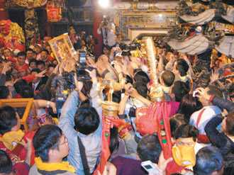 中新網3月26日電 據臺灣《聯合報》報道,大甲媽祖到新港繞境進香,25日上午在奉天宮前廣場舉行祝壽大典,數萬信眾跪地虔誠膜拜為媽祖賀壽,數百米馬路擠得水泄不通。晚間大甲媽回駕,信眾爭相觸摸媽祖金身,場面熱鬧滾滾。
