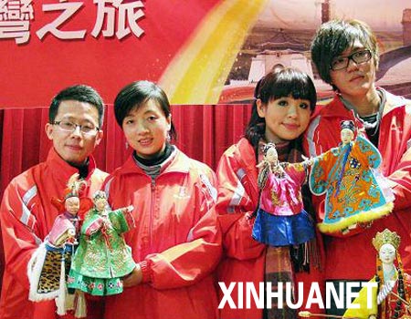 1月14日,兩岸新人在體驗臺灣布袋戲時合影留念。來自大陸的26對新人搭乘兩岸直航班機來到臺灣,將參加于1月15日在日月潭舉行的“日月同喜,喜傳天下”集體婚禮并游覽臺灣名勝古跡,感受當地風土人情。新華社圖